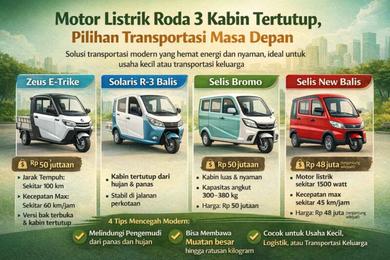 Berikut beberapa pilihan motor listrik roda 3 kabin tertutup yang menarik di tahun 2026.