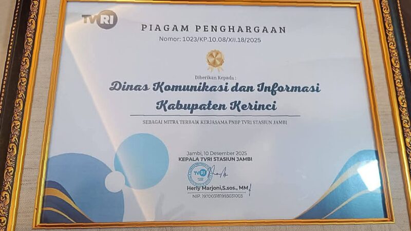 Okepost.id – Rabu, 17 Desember 2025 Pemerintah Kabupaten Kerinci melalui Dinas Komunikasi dan Informatika Kabupaten Kerinci menerima Piagam Penghargaan sebagai Mitra Terbaik Kerja Sama PNBP TVRI Stasiun Jambi pada kegiatan Media Gathering TVRI Stasiun Jambi.