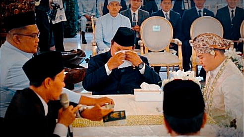 Usai Agung mengucapkan ijab kabul dan dinyatakan sah, Prabowo langsung mengusap air matanya dengan tisu. Presiden tiba di lokasi sekitar pukul 10.12 WIB dan mengikuti prosesi hingga selesai.