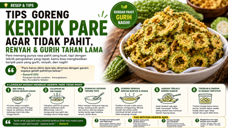Seorang pelaku usaha rumahan, Sunarti (51), membagikan tips sederhana agar keripik pare tidak pahit dan tetap renyah saat digoreng.